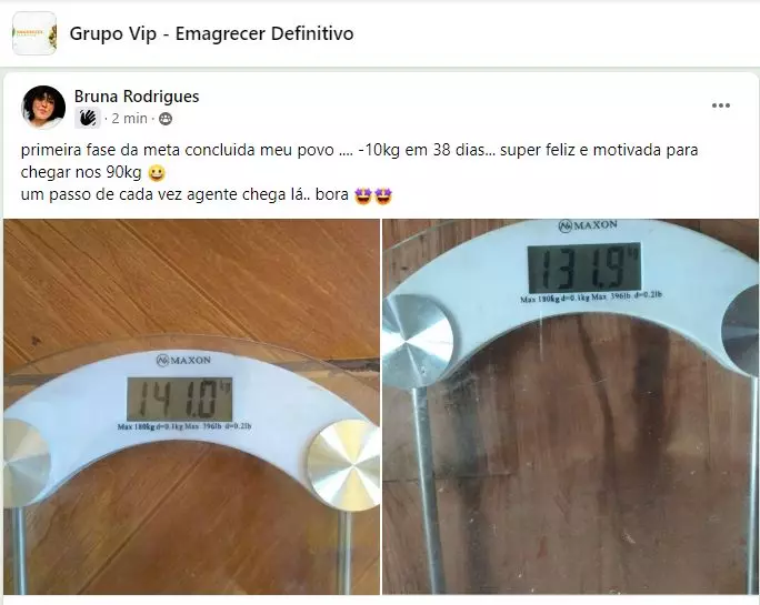 “Eu fazia todo tipo de dieta, sofria e passava fome para olhar na balança e ver que tinha perdido menos de 1kg. Já não sabia mais o que fazer e, então, vi o Guia Emagrecer Definitivo e decidi dar um voto de confiança. Resultado? Perdi quase 5kg em uma semana! Era imensamente gratificante ver as pessoas reparando no meu emagrecimento. Estava super feliz, notando que meus pneuzinhos sumiram, que minha barriga estava secando e, finalmente, perdendo aquela gordurinha chata nos braços. Eu realmente indico, e muito, o programa Emagrecer Definitivo.”