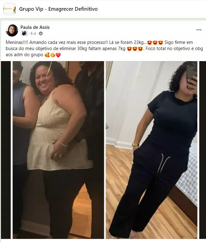“No começo estava um pouco desconfiada, mas isso acabou na primeira semana. Segui o programa direitinho e em apenas 7 dias eu havia perdido quase 4kg. Isso me motivou a seguir em frente e, depois de mais 4 semanas, eu tinha chegado no peso que tanto sonhei. E vou confessar uma coisa: nunca estive tão realizada e feliz com meu corpo!”