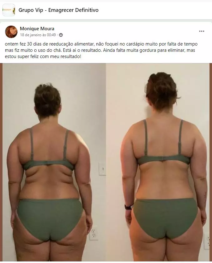 “O Guia Emagrecer Definitivo, além de te fazer secar, mesmo após a gravidez, proporciona a você mais saúde e disposição para os desafios do cotidiano. É o programa perfeito para mamães que assim como eu, mesmo na correria, buscam voltar ao corpo que tinham antes com muito mais energia. Recuperei minhas antigas roupas que usava, e amei o chá. Muito obrigada!”